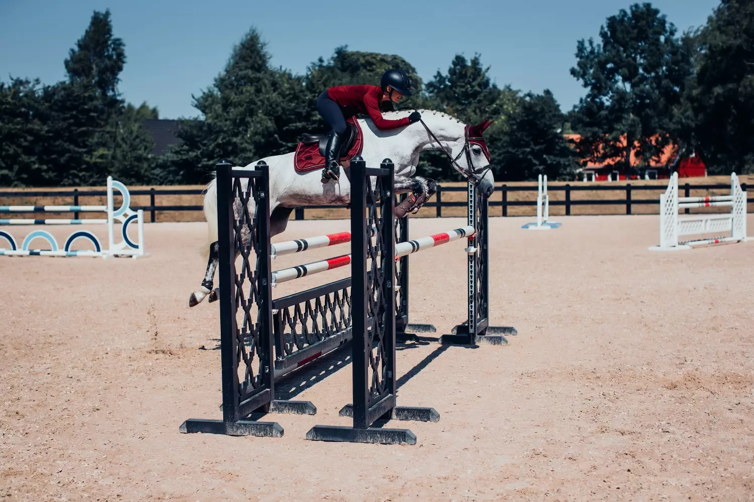 Vakker sprangschabrack i bordeaux med stilige detaljer i sølv. Det skinnende materialet på oversiden gir en lukseriøs følelse og undersiden med quick-dry materiale holder hesten tørr under treningsøkten. Schabracken er quiltet med ES stilsikre mønster og matcher perfekt med resten av Bordeaux kolleksjonen.