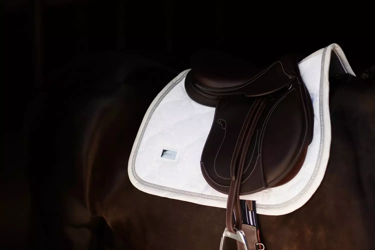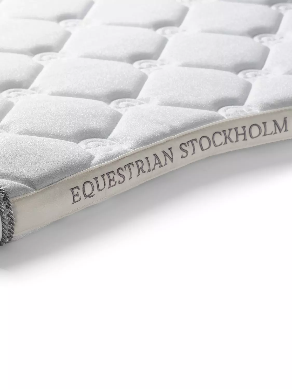 Elegant schabrack i hvitt glitter med sølvdetaljer og bling. Dekorert med Equestrian Stockholm-badge i sølv.
