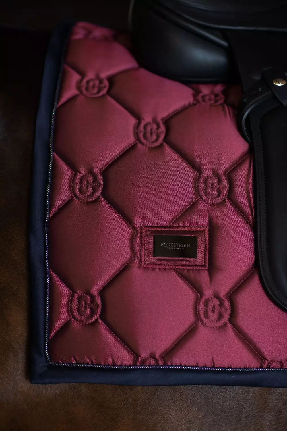 Elegant schabrack i en kald, dyprød farge med navy detaljer. Dekorert med Equestrian Stockholm badge i svart.