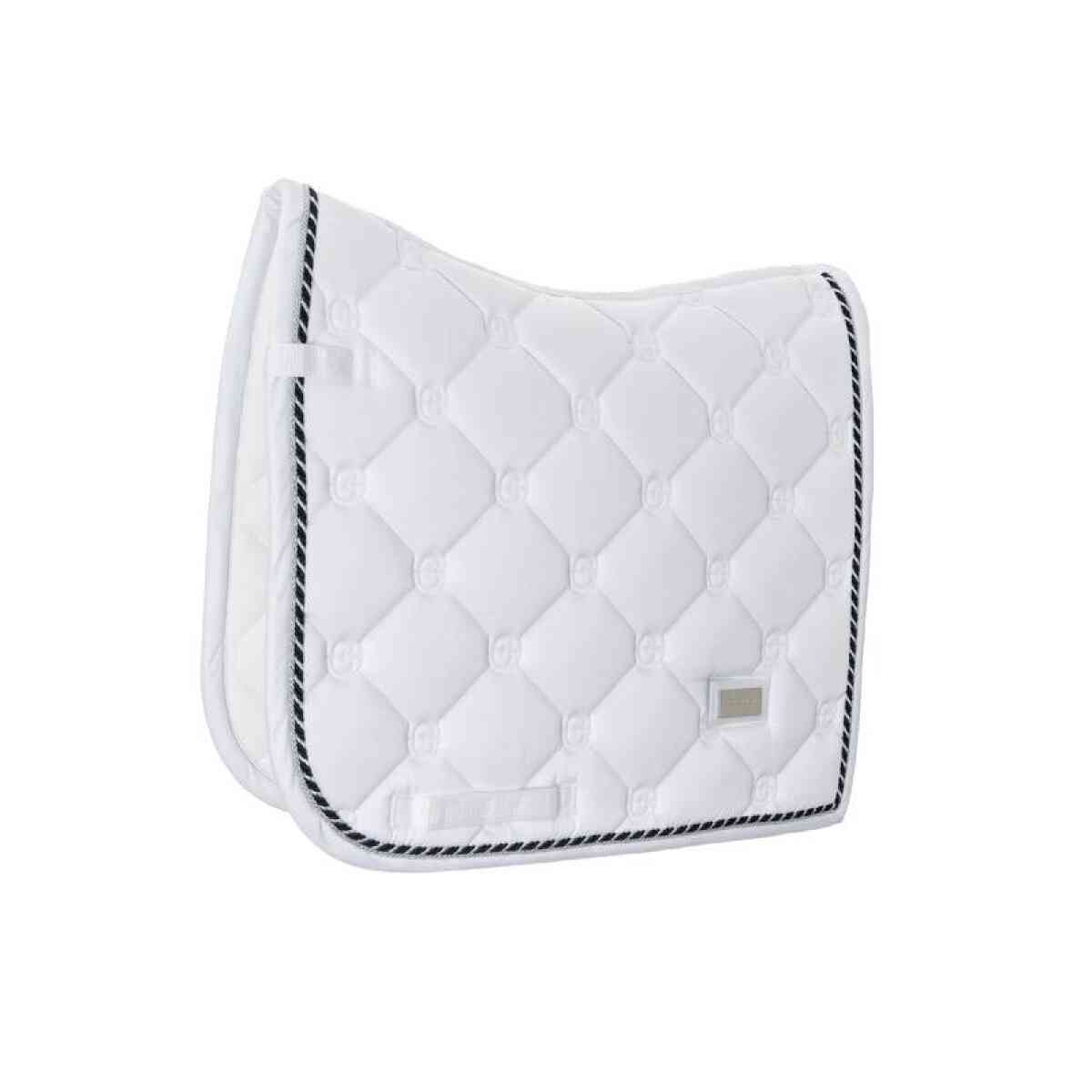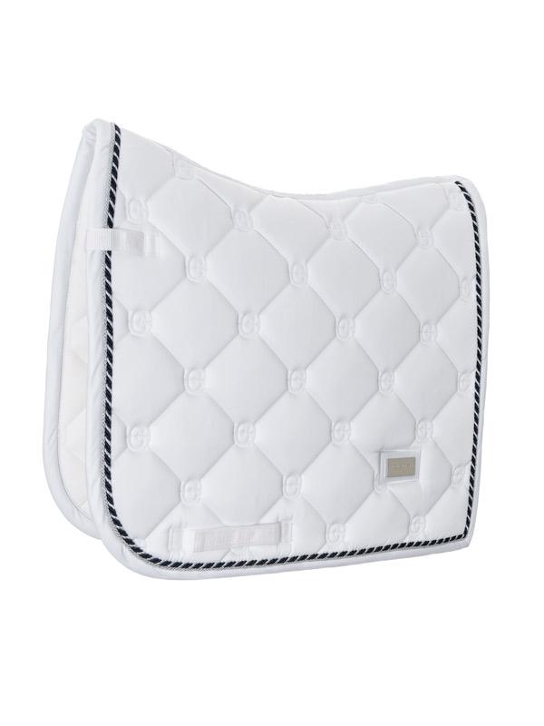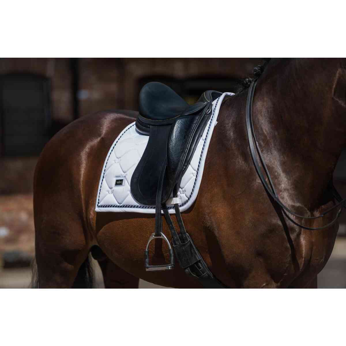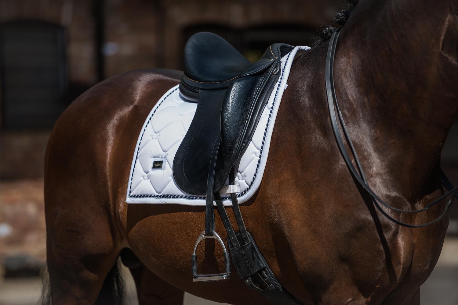 Lukseriøse White Perfection schabrack er perfekt til stevner. Yttermaterialet er glatt og glinsende, samt smussavstøtende. Lekre detaljer i sølv og mønster i Equestrian Stockholm logo.