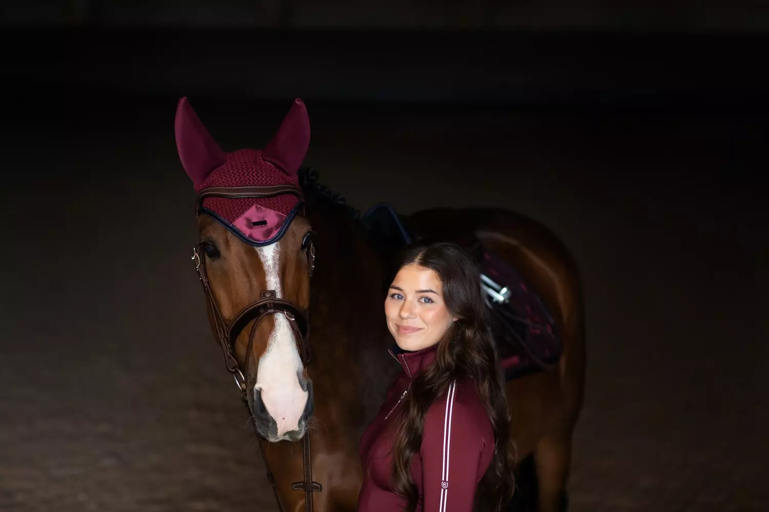 Designet med polstrede ører for å redusere støy. Dekorert med en ton-i-ton satenglapp foran, vakkert kantbånd i navy og sølv og en navy kantbånd. Stylet med Equestrian Stockholm-merket i svart. Ørehetten gir både insektbeskyttelse og støyreduksjon. Matcher perfekt schabracken fra Luxe-kolleksjonen.